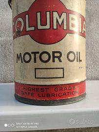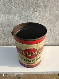 Bidone Columbia Motor oil -Genova- in metallo, degli anni '50, in buono stato, arrugginito leggermente il fondo. Peso 2 kg Altezza 42 cm. Larghezza 30 cm.