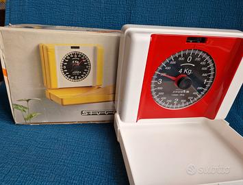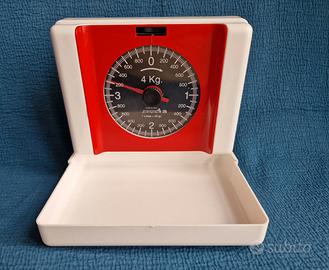 Bilancia da cucina meccanica a muro di colore rosso, modello vintage o da collezione, prodotta da Stube Germania anni '70 Portata massima: 4 kg. Precisione: Divisione di 20 grammi. Caratteristiche: Design salvaspazio con piatto richiudibile e quadrante analogico. Stile: Estetica retro/vintage in plastica rossa e bianca. E' ancora nella scatola originale ed è in ottime condizioni. Sul retro sono presenti tracce di carta incollati durante la lunga conservazione in scatola.
