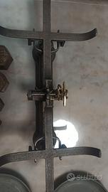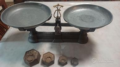Bilancia antica con set di pesi (1 da 1 kg, , 1 da 500 gr., 1 da 200 gr. e 1 da 100 gr.). Attenzione: oggetto solo da arredamento, non utilizzabile per pesare. Buone condizioni, ripulita e trattata con cera specifica per ghisa. Prezzo negoziabile.