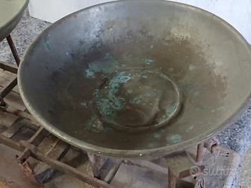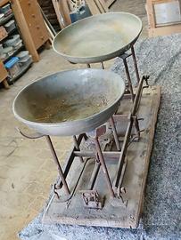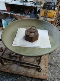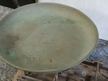 bilancia antica funzionante, su base di legno ,da restaurare , completa di pesi in ghisa. i piatti di ottone sono di diametro e di profondità diversi, il piu fondo è 27 cm l altro meno fondo è 30 cm. la base misura 65x25 . bellissimo oggetto d' arredamento . epoca primi del 900 di nonna fruttivendola