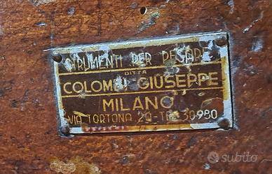 Bilancia vintage Colombo in legno e metallo, con due piatti.