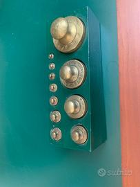 vecchia bilancia verde con filetto dorato piano marmo con tutti i suoi pesi ben conservata