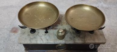 Bilancia con piatti in ottone con struttura in legno e marmo. Peso in omaggio