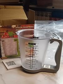 Bilancia da cucina digitale doppia efficienza: il contenitore è realizzato con beccuccio per il versamento agevole di liquidi. È graduata per ml e coppe. Il manico digitale è amovibile e segna sia la temperatura interna dell'ambiente che calcola precisamente: g, ml, oz, cup, ct, lb