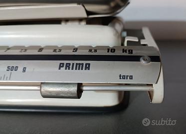 Bilancia da cucina modello meccanico del marchio Prima, con vassoio in acciaio inossidabile e funzione di tara manuale. Capacità di pesatura di 10 kg, con scale graduate in grammi (fino a 500g) e chilogrammi (fino a 10 kg). In ottime condizioni e funzionante regolarmente.