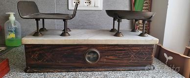 Bilancia da cucina antica perfettamente funzionante. Base in legno e marmo. Piatti in ottone. Set di pesi completo.