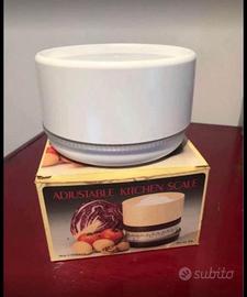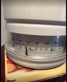 Bilancia bianca da cucina, meccanica, vintage. Il piatto contenitore si gira fino a chiuderla completamente. Pesa fino a 2 kg. Con scatola originale