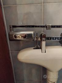 Bilancia medica verticale in metallo verniciato bianco. Nella parte superiore è presente un bilanciere metallico. Nella parte inferiore c'è la piattaforma nera su cui sale la persona. Prodotta da Salus Milano negli anni 60. Il logo è impresso sul bilanciere. L'altimetro e' applicato alla colonna della bilancia e misura da 50 a 205 cm. Funzionante, presenta qualche escoriazione sulla vernice. Consegna solo in zona a causa dei costi eccessivi del trasporto.