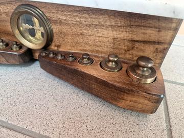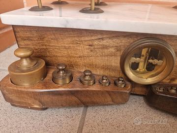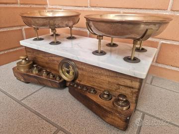 STUPENDA BILANCIA A PIATTI DA TAVOLO IN LEGNO CON RIPIANO IN MARMO E PESI E PIATTI IN OTTONE, PERFETTAMENTE FUNZIONANTE. Comunemente chiamata bilancia Roberval (dal nome del suo inventore Gilles Personne de Roberval), in una versione elegante e "da banco", tipicamente utilizzata in farmacie, laboratori chimici o antiche gioiellerie tra la fine dell'Ottocento e la prima metà del Novecento. Struttura e Materiali: Base in legno e marmo: Il corpo principale è in legno massiccio, sormontato da una lastra di marmo bianco, che serviva non solo come decorazione ma anche per garantire stabilità e una superficie facile da pulire in caso di fuoriuscita di polveri o liquidi chimici. Piatti in ottone: I due piatti circolari sono in ottone. In questo modello sono rialzati su dei supporti (croci) che scendono all'interno del meccanismo attraverso dei fori nel marmo. Meccanismo a vista: Al centro del corpo in legno è presente un'apertura circolare protetta da un vetro (o un oblò in ottone) che permette di vedere l'ago indicatore. Quando l'ago è perfettamente al centro, i due pesi sui piatti sono in equilibrio. Per qualsiasi info in più o proposta sensata scrivetemi un messaggio.
