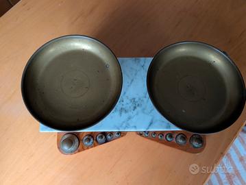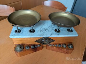 STUPENDA BILANCIA A PIATTI DA TAVOLO IN LEGNO CON RIPIANO IN MARMO E PESI E PIATTI IN OTTONE.RIPRODUZIONE MODERNA DELLA BILANCIA DI UNA VOLTA. da lucidare