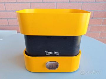 Bilancia da cucina meccanica a molla, disegnata da Marco Zanuso nel 1970. Prodotta dall’azienda francese Terraillon, è stata molto popolare negli anni '70 e '80. Il modello è in plastica di color giallo (più rara), con una vaschetta rimovibile che funge sia da contenitore per pesare sia da coperchio quando la bilancia non è in uso. Capacità di pesata: fino a 2 kg (graduazione in grammi) – Dimensioni cm. 16,50x11 – H. cm. 12 o 16 – Peso gr. 500. Come oggetto di design è esposta al MOMA di New York e alla Triennale di Milano. È pubblicata in Enciclopedia Phaidon Design in 1.000 oggetti al n. 734 – In ottimo stato di conservazione