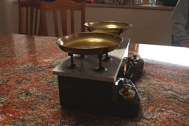 Bilancia antica a due piatti con pesi inclusi, ideale per collezionisti, arredamento vintage o appassionati di oggetti d’epoca. Realizzata con base in legno massello, superficie in marmo e piatti in ottone, si presenta in ottime condizioni estetiche e funzionali. Design classico e robusto, perfetto per dare un tocco di eleganza a qualsiasi ambiente o per esposizione in negozi e ristoranti a tema. Disponibile subito, completa di set di pesi originali.