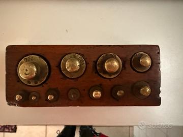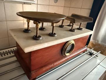 Vendo bilancia antica da banco completa di pesi originali in ottone su base in legno, risalente a fine XIX / inizi XX secolo.
