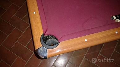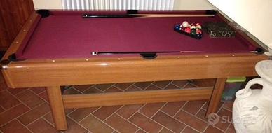 Vendo bellissimo tavolo da biliardo modello Pool Americano (7 piedi), ideale per taverne o sale hobby. Il tavolo è in ottime condizioni, panno color bordeaux perfettamente integro e sponde reattive. Misure esterne: 210 x 120 cm circa. Campo da gioco: 180 x 90 cm. Accessori inclusi: 4 stecche, set completo di bilie numerate, triangolo, gessetti e spazzola originale per la pulizia del panno. Il tavolo è leggero e facile da trasportare rispetto ai modelli in ardesia. Smontaggio e trasporto a carico dell'acquirente.