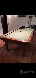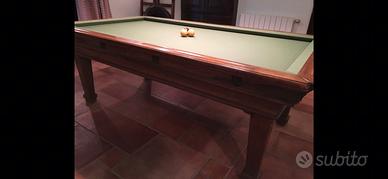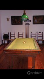 Bellissimo biliardo antico in rovere completamente ristrutturato, panno e sponde nuove, ingombro 120 x 220, ottimo anche come arredamento e/o tavolo da pranzo, vendo per inutilizzo, insieme a tutte gli accessori (palle, stecche, portastecche, segnapunti, lampadario).