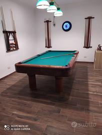 Biliardo Longoni pool professionale + 16 stecche, tra cui 2 Longoni + 3 portastecche a parete + palle e triangolo + lampade di lusso.