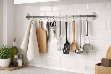 Binario da cucina Ikea Hultarp in acciaio inox nichelato, lunghezza 80 cm con 15 ganci. Design semplice e linare, pensato per ottimizzare lo spazio in cucina appendendo utensili, accessori e canovacci, così da liberare il piano di lavoro e avere tutto a portata di mano. Nuovo, mai utilizzato. 15€ tutto