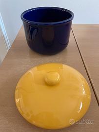 Biscottiera in ceramica blu con scritta nera BISCOTTI e coperchio giallo. Misure: altezza con coperchio 16 cm , diametro cm 19.