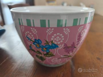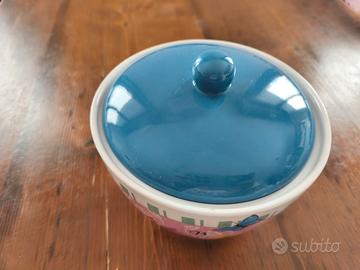 Biscottiera in ceramica con un grazioso design floreale e una farfalla blu. - Decorazione floreale con fiori rosa e gialli. - Dettaglio di una farfalla blu. - Coperchio blu coordinato.