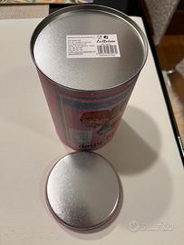 Biscottiera in latta con motivo a stampe ea fondo rosa, con tappo rotondo ermetico.