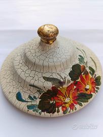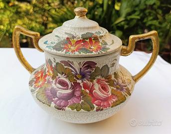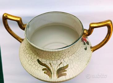 Meravigliosa biscottiera o portafrutta o ciò che si vuole di rara manifattura. Manici dorati ed effetto craquelé su tutto il vasellame di gran pregio. Sopra un tavolo di legno o tavolo modernissimo diventa un punto d'attenzione fenomenale. Pezzo unico. Misure: diametro della pancia della biscottiera cm 21. Condizioni splendide.