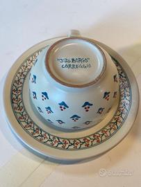 Biscottiera e tazza in ceramica artistica de "Il Borgo" di Correggio (RE) Storico laboratorio di ceramica artistica. Ottime condizioni a parte una piccola scheggiatura sulla biscottiera
