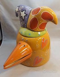 Deliziosa biscottiera vintage in ceramica a forma di testa d’uccello dal lungo becco con cappello da giullare