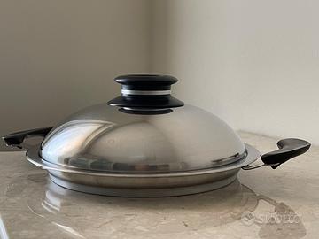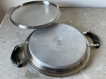 Bistecchiera AMC 24 cm diametro. Ottimo acciaio come lo facevano una volta, rimane sempre bello argento anche con la cottura non ingiallisce. La vendo perché purtroppo non ho più il gas . Non è per induzione. Sostituito il pomolo con Visiotherm Serie M29. A scelta coperchio piano o coperchio bombato.
