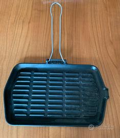 Vendo bistecchiera rettangolare ILSA Dietella in ghisa, Art. 205, misura 23x36 cm, completa di scatola originale. La piastra ha superficie rigata ed è dotata di manico pieghevole in metallo. L'oggetto è usato, in buone condizioni generali, con normali segni del tempo e dell'utilizzo visibili soprattutto sul fondo e in parte sulla superficie.