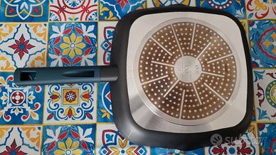 Bistecchiera antiaderente quadrata (lunghezza totale col manico 47 cm) marca Infinity Chefs con qualche segno sul fondo (come visibile nelle fotografie, in qualche punto il rivestimento antiaderente si è leggermente rovinato, ma è stata usata 5 volte al massimo).