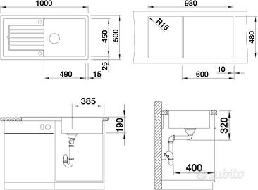 Classico lavello da incasso : per mobili da incasso larghi 60 cm con vasca extra grande e sgocciolatoio.