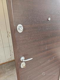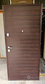 porta blindata 90 × 210 sinistra, con rivestimento interno laminato wenghe, rivestimento esterno okumè pino pantografato e verniciato tinta noce chiaro, completo di telaio perimetrale, maglieria e accessori cromo satinato, serratura a cilindro europeo e seconda serratura di servizio, occhio magico e soglia mobile a pavimento