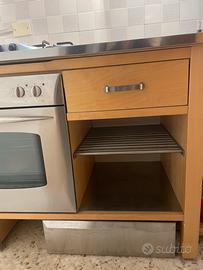 Cucina modello VARDE IKEA anno 2004. Piano acciaio, cassetti in legno ,vano fuochi, vano sottocassetti con ripiani grigliati in acciaio + cassetti autonomi con ruote da sotto vano . Il forno inserito marca REX . Il piano cottura franke . I cassetti presentano usura nel bordino laterale interno ma facilmente sostituibili.
