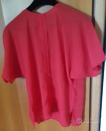 Blusa ampia con maniche a kimono. Usabile anche come copricostume corto. Disegno con pailettes sul davanti. il colore rosso e meno acceso e più tendente al vinaccia (ma non riesco a renderlo in foto). Poliestere. Taglia L.