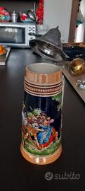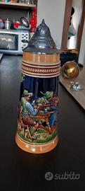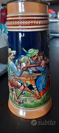 Bellissimo boccale di birra tedesco da 1 litro in ceramica con tradizionali e goliardiche scene in bassorilievo in vividi colori.