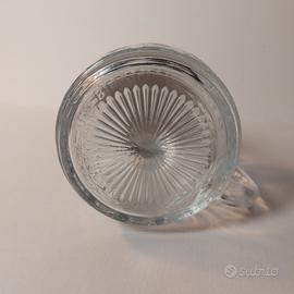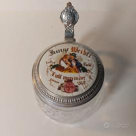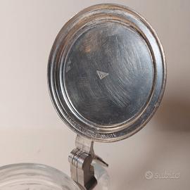 Boccale da birra in vetro con coperchio in metallo e decorazione sul coperchio.