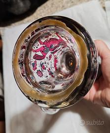 Boccale da birra vintage in vetro, midello raffinato, con decori in smalto, il design è tipico dello stile folkloristico (trachten). Le immagini raffigurano scene di caccia e vita cortese medievale rinascimentale. Dama a cavallo con un falco e un cacciatore con i cervi. L'uso del rosso cremisi e del nero su vetro trasparente, suggerisce una produzione della metà del XX secolo (anni 50/70). Il coperchio in peltro (Zinn) e lega simile. Il pomello il dettaglio superiore è un vetro sfacettato color ambra. La leva che si preme con il pollice per aprire il coperchio ha una forma ornamentale complessa quasi araldica che indica una lavorazione curata stile rustico tedesco /bavarese.