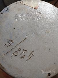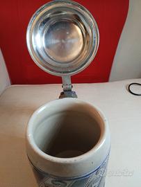 Boccale da birra tedesco, numerato e marchiato,prodotto Merkelbach, in gres smaltato al sale, presenta motivo floreale a rilievo cobalto blu e grigio.Coperchio in peltro.