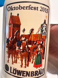 Boccale in ceramica Löwenbräu della Festa della Birra Oktoberfest a Monaco di Baviera, Germania, del 2015. Decorato con scene tradizionali.