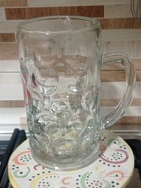 Boccale di birra con manico e con logo Raffo. In vetro spesso e trasparente.Altezza 20 cm e diametro 10 cm. Anni '70.