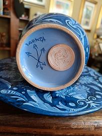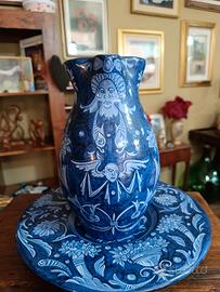 boccale in ceramica blu e bianca con piatto abbinato, decorato con figure antropomorfe e floreali. Produzione Vasalia Faenza