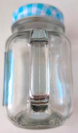Vendo boccale in vetro con manico e tappo a vite decorato.