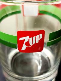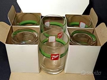 Confezione con n 6 bicchieri Seven Up, marchio di bevande gasate al limone e lime, originali anni 80 in vetro trasparente con fascia decorativa verde e logo rosso 7up.