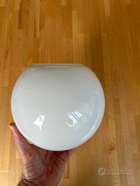 La classica boccia in vetro che si trovava nelle case dal 1930 in poi, frequentemente come illuminazione di bagni o zone di ingresso a seconda del portalampada. In vetro bianco, diametro 18 cm e apertura di 10cm per l’innesto del portalampada. Ottimo stato do conservazione, potrebbe eseree usata creativamnete anche come vaso.