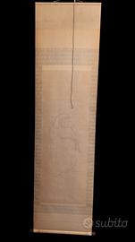 Kakemono, rotolo appeso giapponese, datazione 1880/1910. Originale dipinto a mano. In basso si trova la firma ed il sigillo. Rappresenta il monaco Bodhidharma, conosciuto in Giappone come Daruma. Bodhidharma è venerato come il fondatore del Buddhismo Zen. In ottime condizioni, presenta alcune piccole macchie. dimensioni: altezza 195cm larghezza 55 cm