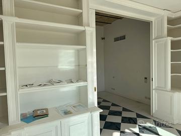 Boiserie completa con librerie, armadi ad anta, copertura a controsoffitto.