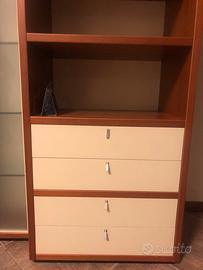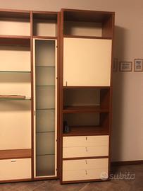 Antine a vetrinette e ripiani in cristallo abbinata a mobile con libreria ciliegio e panna montabili anche divisi
