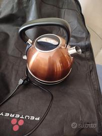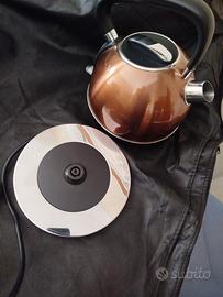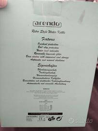 Bollitore Arendo da 1,7 l, 2200 W, acciaio inox, stile retrò vintage, protezione contro il surriscaldamento e l'asciugatura. Descrizione e dati del prodotto Non solo per i nostalgici: Arendo - Bollitore in acciaio inox Vintage Retro Style con un elegante design retrò in rame! Elegante design in rame in acciaio inossidabile di alta qualità e antiruggine:se volete portare in cucina un po' di nostalgia degli anni '50, il bollitore in acciaio inossidabile Arendo Vintage Retro Style dall'elegante design in rame con applicazioni in argento e nero è perfetto per voi. Ideale per riempire grandi tazze:L'elegante bollitore in acciaio inox in stile vintage retrò di Arendo offre una capacità di riempimento di 1,7 litri. La grande capacità rende l'apparecchio ideale per riempire grandi brocche. Grazie all'indicatore del livello dell'acqua, di facile lettura e dotato di tacche di riempimento, l'operazione risulta agevole. stazione base a 360 gradi:il potente bollitore da 2200 W può essere posizionato comodamente in qualsiasi momento. Indipendentemente dalla posizione in cui viene collocato sulla stazione base, si riscalda sempre senza problemi. Massima sicurezza:la funzione di spegnimento automatico garantisce la necessaria sicurezza durante il funzionamento. Il bollitore retrò in acciaio inox si spegne automaticamente non appena viene raggiunta la temperatura di ebollizione, quando il livello dell'acqua è troppo basso o quando l'apparecchio viene rimosso dalla base. Le funzioni di sicurezza comprendono anche la protezione contro l'ebollizione e il surriscaldamento. Godimento dell'acqua pura:un filtro anticalcare integrato nell'erogatore è particolarmente utile per l'acqua del rubinetto contenente calcare. Il filtro rimovibile davanti all'erogatore filtra le particelle di calcare, garantendo un'acqua più pura e un sapore migliore. Dettagli tecnici: Alimentazione: 220-240 Volt, 50/60 Hertz Consumo di energia: max. 2200 W Capacità: massimo 1,7 litri base a 360° con avvolgicavo