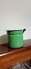 Bollitore latte smaltato vintage. Marca Queen. Smalto perfetto, eccetto piccolissimo segno nella griglia, come da foto. Capacità 1 lt. Dimensioni: diametro alla base cm 12, diametro bordo superiore cm 15, altezza cm 14, manico cm 13.