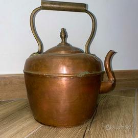 Elegante e autentico bollitore antico in rame, risalente ai primi del '900, realizzato interamente in rame battuto con manico mobile in ottone. Il beccuccio sinuoso e il coperchio bombato con pomello centrale evidenziano una lavorazione artigianale d’epoca, funzionale ma anche esteticamente raffinata.
